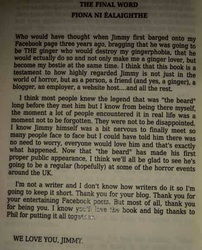 But that wasn't all he did, he knew that the only person who could write the afterword was my bestie best of the bestest Fiona Ní Éalaighthe. I took me over a day to be able to finish her touching afterword, even as I type this I can feel the tears are forming again. You are a true friend, one of those rarest of people that I just click with, a person who I miss when you are not about, and a person whose company I never tire of. The rapport that we have where we can just talk nonsense to each other is one of my favourite things in the world. I have spent four and half days trying to put into words just how much this means to me, and if you check out the video you can see just how touched I was that every single one of you took the time and effort to create this most amazing gift. I had no idea that the degree of love was so high. This was way and above anything I could ever have dreamed off. Even here on Tuesday morning I can feel the emotions rising when I think about it. I will be forever in your debt for this. Phil Sloman, Mark West and Graeme Reynolds thank you from the bottom of my heart for putting these stories into a physical hardback copy. It is sitting with pride of place on my office desk. Click on images for full picturesThe rest of Saturday was spent hunting down Laura Mauro, it would have helped if I remembered that she has shaved her hair off for charity not that long ago, so I spent most of the afternoon going up to the numerous blue hair females going "nope you're not her". I did get to finally meet her thankfully. The rest of Saturday was all about getting ready for the disco, but before we could finally go and dance we went to Neil Buchanan's excellent reading of his rather gory mix off a zombie and Clive Barkeresque short story. Well done Neil that was a rather visceral and stomach churning piece. And then it was disco time, and yes Jimmy did go and dance and yes I did lose my phone gain for the second year running. Such a pity the disco finished too soon, and such a pity I didn't remember meeting Pixie, even if I did almost hug the life out of her. Sundays have always been a day of quite goodbyes and final catch ups. Had a great chat with Steven Savile and after being passing strangers last year it was great to finally meet Adele Wearing. Losing to Ramsay Campbell in the non fiction awards was the best way I could imagine losing, just being nominated for the award alongside such great writers was an honour in itself. I can safely say that Fcon 2015 was a roaring success, the sense of joy and community that sometimes appears to be absent on social media is totally gone, to the point where I now 100% believe that the so called lack of community is a total misconception brought about by the ability of places like Facebook to isolate you into small groups automatically. This was a weekend that totally transformed me, I had been in a bad place, not just with the website, everything had been getting on top of me, to the point were I was at my lowest ebb for a long long time, possible ever. But after spending such a fabulous weekend in the company of the most amazing people I have been lifted so far out of this trench that I can say I have been reenergised, reinvigorated and ready to face the world with a smile on my face rather than the scowl that had been permanently plastered on it. Thank you to every single one of you mad glourious people I needed this weekend more than any of you could have imagined. Here is to next year let the good times roll again. Comments are closed.