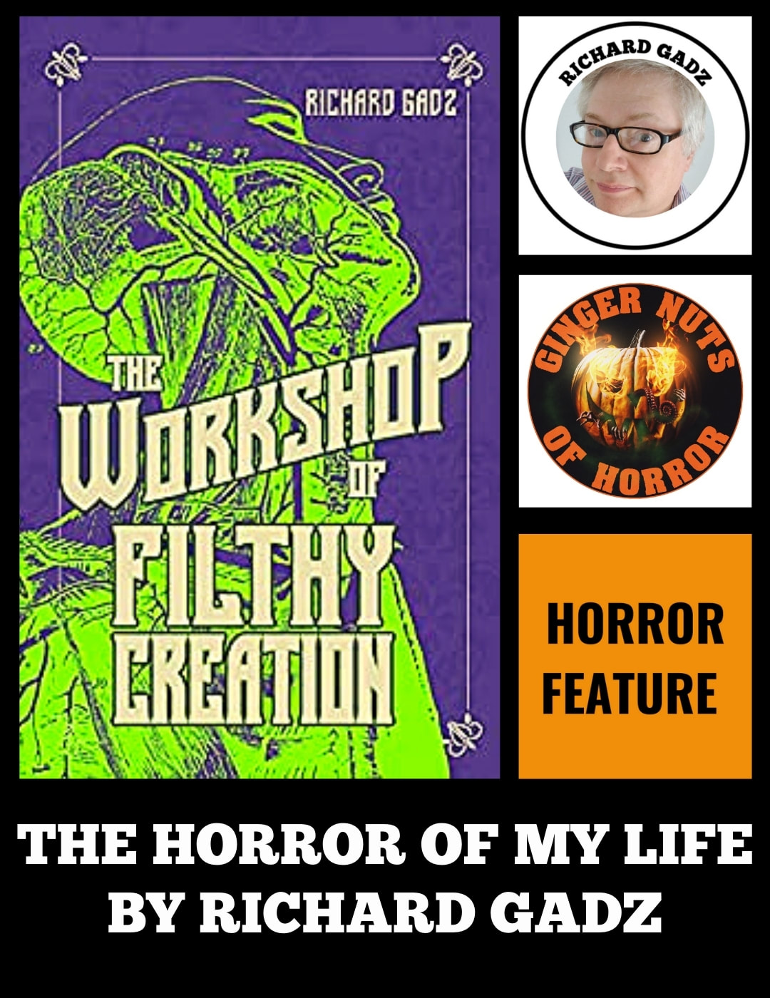 BIO Richard Gadz is the pen name of Simon Cheshire, author of the highly acclaimed horror novel Flesh & Blood. He lives permanently in Warwick, not far from the famous castle, although he spends most of his time in a world of his own. WEBSITE LINKS www.richardgadz.co.uk https://twitter.com/Frankenwriter https://www.instagram.com/richardgadz.horror.writer/ https://www.amazon.co.uk/Richard-Gadz/e/B096SZSCRD linktr.ee/richardgadz THE FIRST HORROR BOOK I REMEMBER READING A book for kids by Aiden Chambers called Haunted Houses, which told the stories of a dozen or so real-life hauntings. It was terrifying and I loved every word of it. THE FIRST HORROR MOVIE I REMEMBER WATCHING One night, when I was about 7 or 8, I came downstairs because I couldn’t sleep and the original Vincent Price version of The Fly was just starting on TV. “Ooo, can I watch this, Dad?” “No, you can’t, it’s not for children.” “Pleasepleasepleasepleaseplease?” “OK, fine. You’ll be scared!” I was. A lot. THE GREATEST HORROR BOOK OF ALL TIME You can’t do better than a volume of H.P.Lovecraft short stories. THE GREATEST HORROR FILM OF ALL TIME My all-time favourite is James Whale’s Bride of Frankenstein, but for sheer un-nerving fear I’d say either Hereditary or, of course, The Shining. THE GREATEST WRITER OF ALL TIME I think it’s a tie between Lovecraft, Poe and Shirley Jackson. THE BEST BOOK COVER OF ALL TIME Any of the covers for the old paperback Pan Books of Horror Stories, but especially the second and fourth volumes. Whoever designed them was a genius. THE BEST FILM POSTER OF ALL TIME The ‘80s version of Fright Night. Still creeps me out. THE BEST BOOK / FILM I HAVE WRITTEN Well, I’m hoping I haven’t written it yet, but the one I’m most proud of is my new novel The Workshop of Filthy Creation. It’s taken well over a decade to get from head to page. THE WORST BOOK / FILM I HAVE WRITTEN I know exactly which one, and no, I’m not going to tell you the title. It wasn’t horror, I’ll say that much. THE MOST UNDERRATED FILM OF ALL TIME There’s a recent low budget British horror-comedy called Double Date, which is just brilliant. It includes the best punch-up I’ve ever seen! THE MOST UNDERRATED BOOK OF ALL TIME The Darkest of Nights by Charles Eric Maine. It’s SF, but it’s certainly scary! THE MOST UNDERRATED AUTHOR OF ALL TIME I’m surprised Michael McDowell isn’t better known, but at least some of his work is being reprinted now. THE BOOK / FILM THAT SCARED ME THE MOST Orwell’s 1984. End of. THE BOOK / FILM I AM WORKING ON NEXT I’m currently writing a haunted house story set in the 1970s, and after that I’ll be doing a sort of semi-follow-up to The Workshop of Filthy Creation. The Workshop of Filthy Creation |